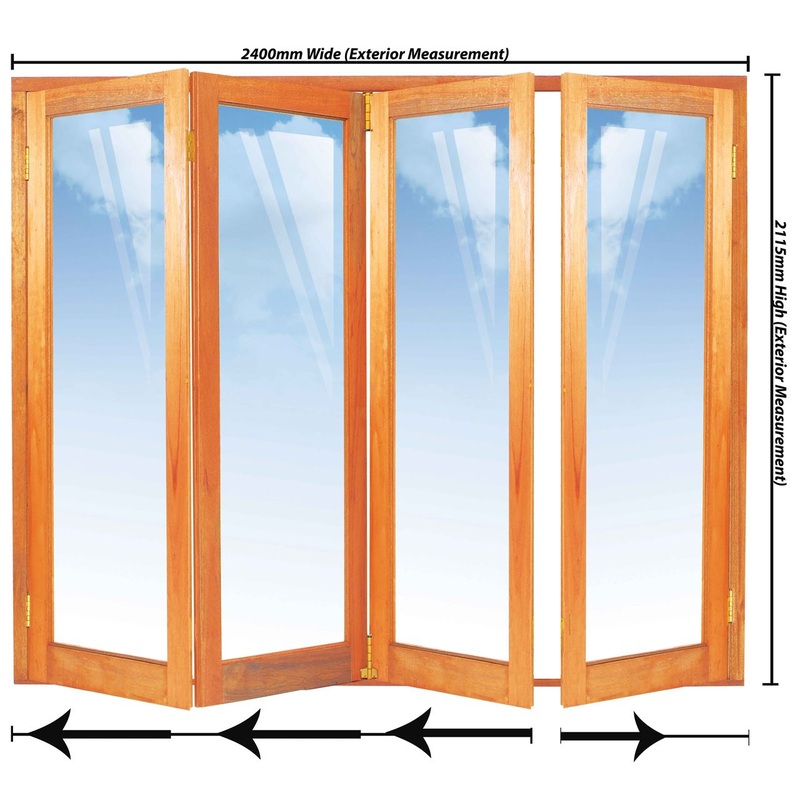 Meranti Timber Full Pane Folding Stacking Door Unit with three door leaves stacking to left hand side & one door hinged on the right-hand side.2400mm wide X 2115mm highWhenviewed from the outside, three doors stack to the left-hand side & one door is hinge