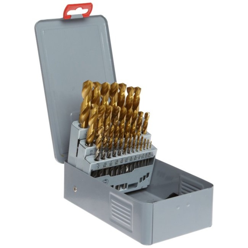 YG-129 PC SET, 1/16″ thru 1/2″ by 64thsMPN: D1GP182SETGOLD-P COATED HSS DRILLS HSS Straight shank Jobber lengthFEATURESFlute Geometry: Right hand spiral, wider flutes Point: 135-Degree split point… .059 diameter and over. Surface treatment: Bright body TiN coating on working part. Application: Drilling in steel, cast steel, alloyed and nonalloyed, grey cast iron, graphite, malleable cast iron.INCLUDED SIZES (ONE OF EACH)1/16, 5/64, 3/32, 7/64, 1/8, 9/64, 5/32, 11/64, 3/16, 13/64, 7/32, 15/64, 1/4, 17/64, 9/32, 19/64, 5/16, 21/64, 11/32, 23/64, 3/8, 25/64, 13/32, 27/64, 7/16, 29/64, 15/32, 31/64, 1/2 PKG QTY: 1 SET (METAL INDEX BOX INCLUDED)
