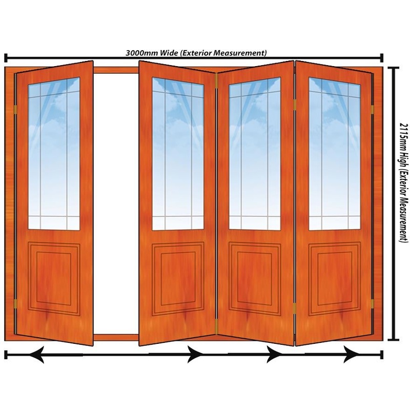 Happy Door StylePane Meranti Folding Stacking Door Unit with three leaves stacking to the right-hand side & one hinged on left hand side.3000mm wide X 2115mm high.Whenviewed from the outside, three doors stack to the right-hand side & one is hinged on the