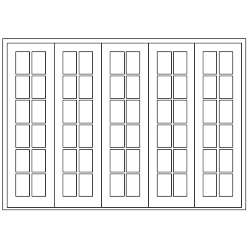 Meranti TimberStrongwoodFolding Stacking Door Unit with all five leaves stacking to the left-hand side.Solid Lengths of Steel Encased in the Cottage Pane Bars.3000mm wide X 2115mm high.Whenviewed from the outside, all five doors stack to the left-hand side