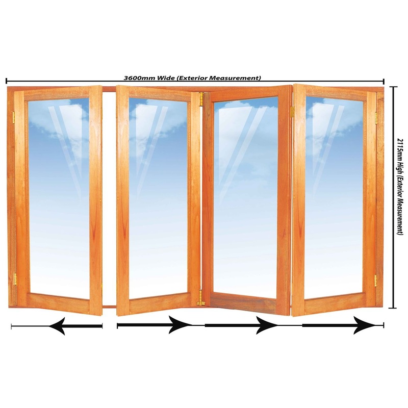Meranti Timber Full Pane Folding Stacking Door Unit with three door leaves stacking toright hand side & one door hinged on the left-hand side.3600mm wide X 2115mm highWhenviewed from the outside, three doors stack to the right-hand side & one door is hinge