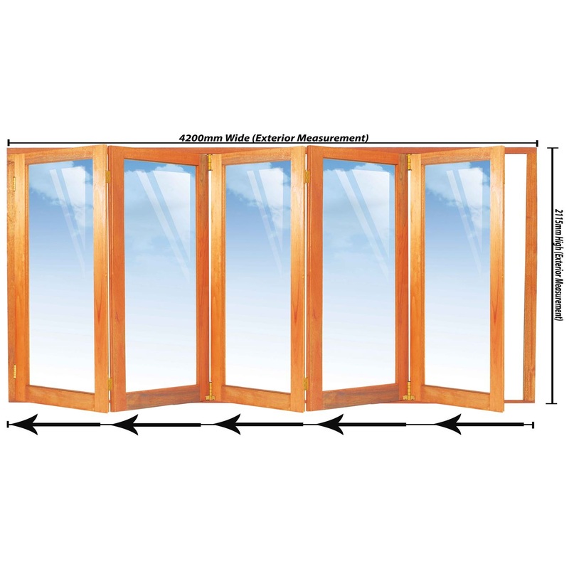 Full Pane Meranti Folding Stacking Door Unit with all five leaves stacking to the left-hand side.4200mm wide X 2115mm high.Whenviewed from the outside, all five doors stack to the left-hand side.Doors stack outwards.Includes Factory Fitted Lock, handles &