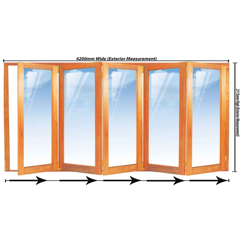 Full Pane Meranti Folding Stacking Door Unit with all five leaves stacking to the right-hand side.42000mm wide X 2115mm high.Whenviewed from the outside, all five doors stack to the right-hand side.Doors stack outwards.Includes Factory Fitted Lock, handles