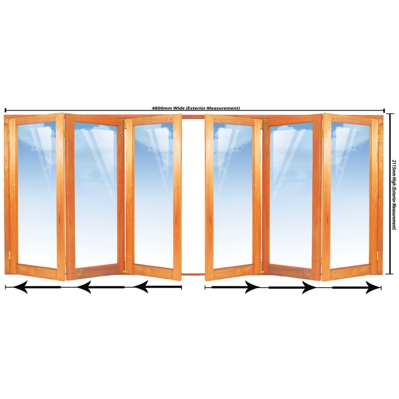 Full Pane Meranti Folding Stacking Door Unit with three leaves stacking to the left-hand side & three leaves stacking to the right-hand side4800mm wide X 2115mm high.Three doors stack to the left-hand side & three doors stack to the right-hand side.Doors s