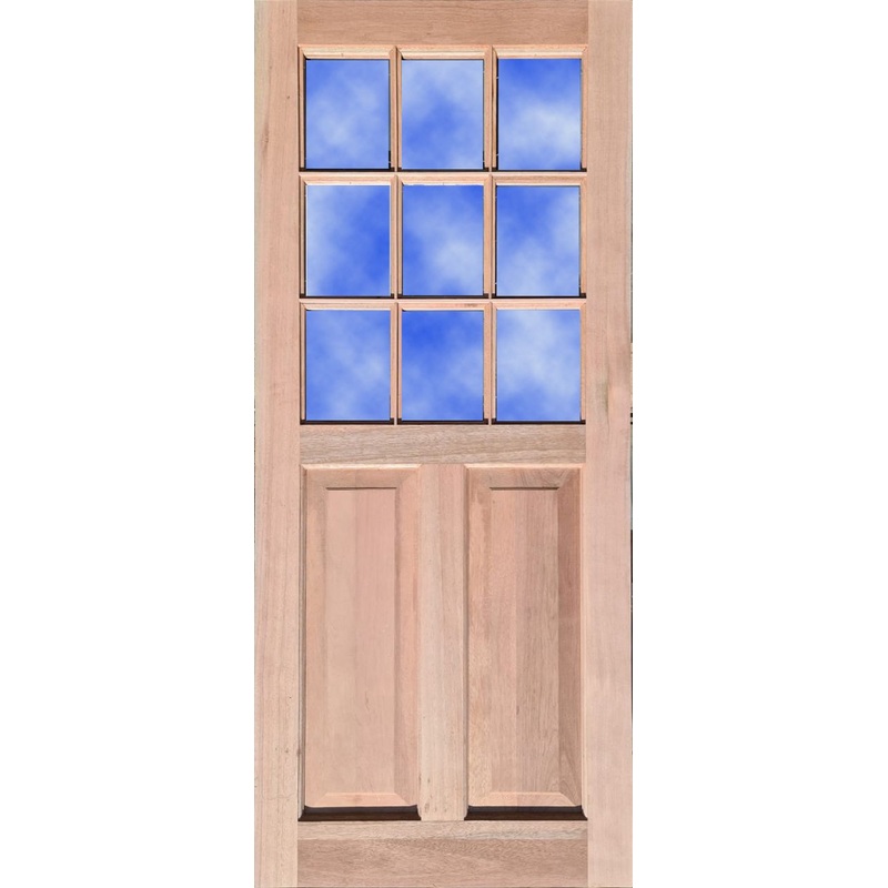 9 Light Top 2 Panel Bottom Door is a combination of a traditional raised and fielded panel design together with a cottage pane top.FeaturesMade from solid kiln dried meranti9 glass panels at the top2 Solid & Raised Panel bottomDoor is supplied without glas