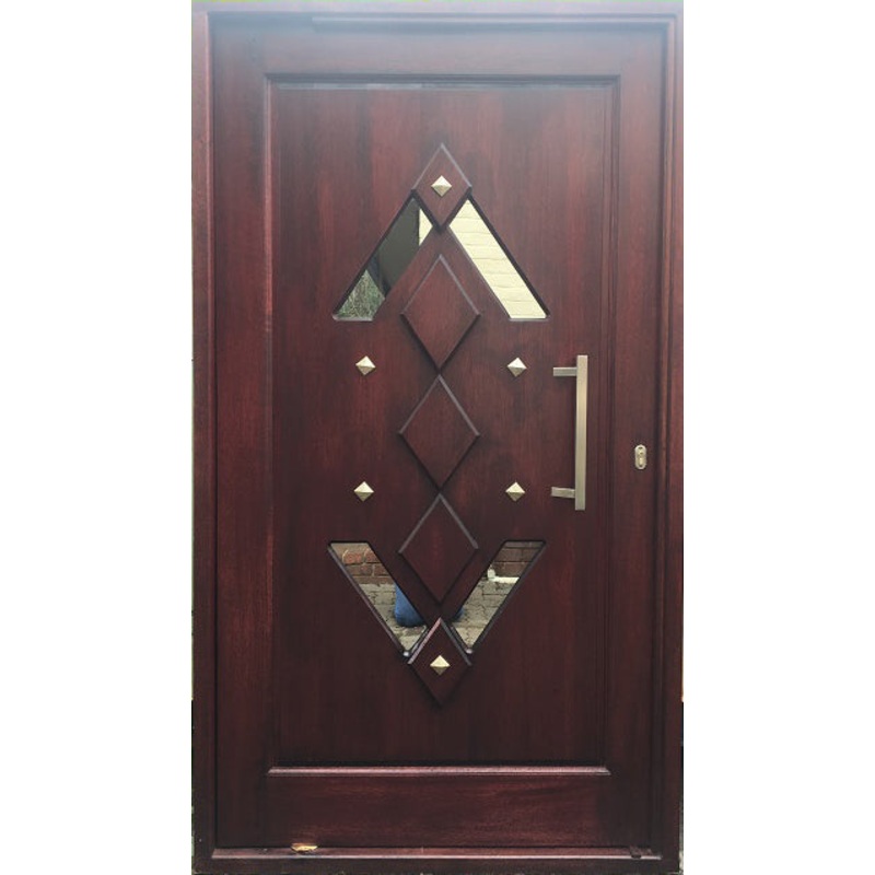 A13 Pre Hung Pivot Door with Diamond Design, Studs, Glass & Raised Pattern 1200W X 2120 in Frame complete with factory fitted lock, pivot hinge & handlesKey Features:Pre-hung Pivot Door: Simplify installation with our pre-hung design, ensuring a seamless fit into your space.Premium Saligna Timber: Experience the beauty and durability of Saligna Timber, providing a natural and timeless aesthetic.Decorative Inlay: The door features an elegant decorative inlay on the outside, adding a touch of sophistication to your entry.6.38mm Safety Glass: Enhance security and aesthetics with the inclusion of 6.38mm safety glass, providing both transparency and safety.Inward Opening: The door opens inwards, optimizing space and allowing for a graceful entry experience.Left & Right Hand Opening Options: Choose the opening direction that best suits your preferences and space configuration.Pre-Oiled at Factory: Enjoy the convenience of a pre-oiled finish, adding an extra layer of protection and highlighting the natural beauty of the timber.Custom Sizes Available: Need a specific size? Contact us at [email protected] for personalized sizing options and pricing.6 Month Manufacturers Guarantee: Rest easy with our 6-month guarantee, reflecting our commitment to product quality and customer satisfaction.