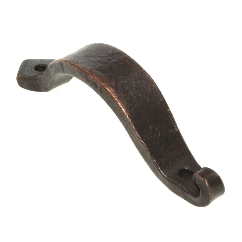 Oil-Rubbed Bronze curved pull cabinet surface mount rough iron handle with 2 7/16 inch center screw spacing, model IPLQP from Acorn Manufacturing.Acorn Manufacturing small cabinet curved pullOil-Rubbed Bronze finish, rough iron materialsImported from Europ