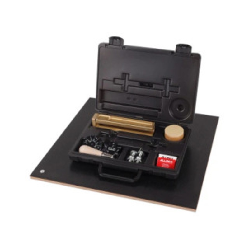 Extension-style kits feature premium, brass cutter block with contoured edges to minimize gasket material buckling and assure precision cuts. Ergonomic design offers secure, comfortable grip. Easy-to-read, engraved, precision scale. Sliding, knurled nut adjusts cutting radius. Chrome-plated, steel extension bars provide for cuts up to 1550mm (61) in diameter. Hex screws hold cutting blade for cuts up to 19.05mm () in depth. 457mm x 457mm (18 x 18) cutting board features plastic non-slip, textured surface that reduces blade friction, minimizes breakage, and self-heals after each use. Includes rugged storage case, dove-tail designer template, bolt hole locator template, and center pin handle.