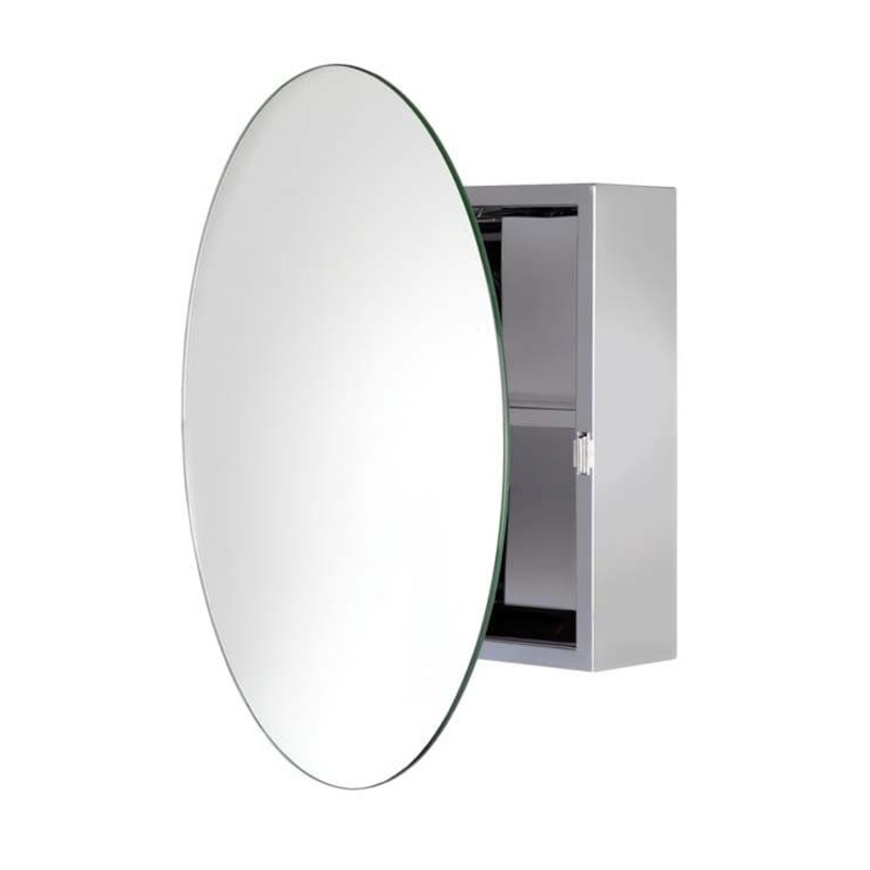 Stainless steel cabinet with mirrored doorDiscreet storage solution, ideal for small spacesCircular (500 mm diameter) mirrored glass doorSupplied fully assembled90 Degree pivot hingeFixed internal stainless steel shelfEasy to install, all fixtures and fitt