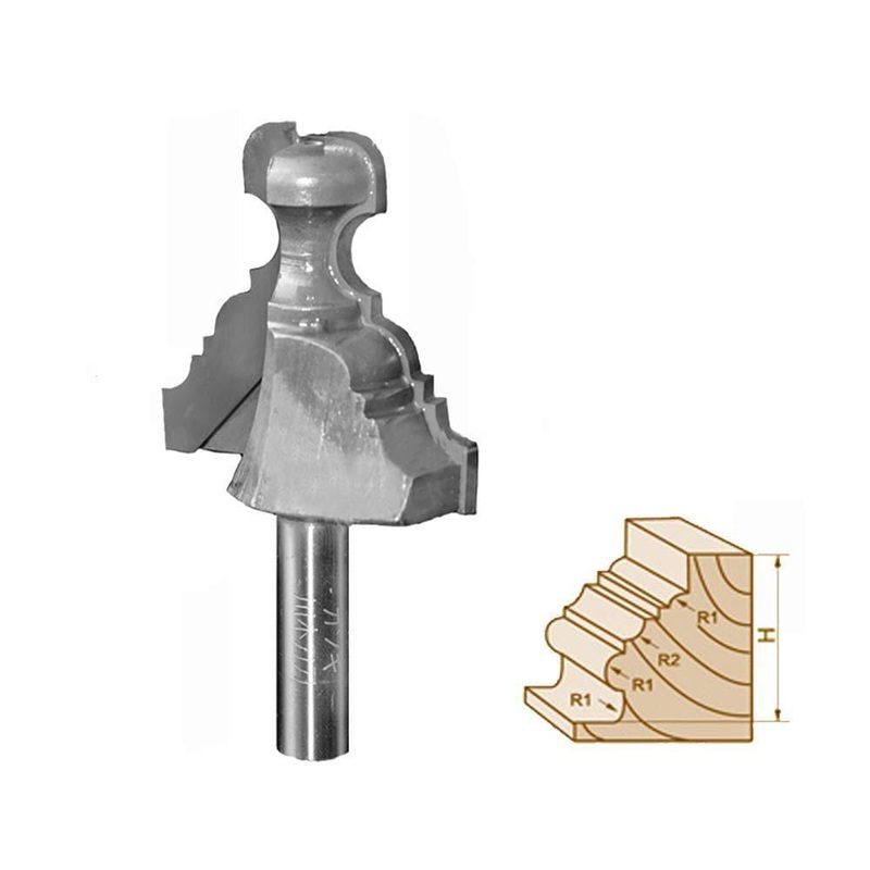 The Architectural molding router bits are ideal for adding elegant decorative profiles to your house cornice. Findbuytool offers a full selection of industrial-grade architectural molding router bits suitable for various router tools.FeaturedThe router bit is made of top-quality carbide tips.Suitable for making architectural shapes for your workpiece, and also can create various shapes by adjusting the cutting height.It can cutsoftwood, hardwood, plywood, composites, and laminates.Distinguished cutting efficiency without chips and burrs.With continuing sharpness and durability.Note: For your safety, please pay attention to the RPM and feed speed when cuttingharder or denser wood. And always wear safety equipment.Technical informationShank Size x D(inch)DR1R2HMaterial1/2 x 1-1/21-1/2″(38.1mm)3/32″(2.38mm)1/8″(3.17mm)29/32″(23mm)Tungsten Carbide1/2 x 1-3/41-3/4″(44.45mm)1/8″(3.17mm)5/32″(3.96mm)1-3/16″(30.18mm)Tungsten Carbide1/2×22″(50.8mm)5/32″(3.96mm)3/16″(4.76mm)1-15/32″(37.24mm)Tungsten Carbide1/2 x 2-1/42-1/4″(57.16mm)3/16″(4.76mm)1/4″(6.35mm)1-11/16″(42.83mm)Tungsten Carbide1/2×2-7/162-7/16″(61.91mm)7/32″(5.55mm)9/32″(7.14mm)1-31/32″(49.95mm)Tungsten CarbideApplicationsWoodMachineCNC RouterFixed Base RouterPlunge RouterBench Top Router TableSHIPPING DIAMETERUNITPcsNet Weight50PackageIn Plastic BoxPackage Size95 x 18 x 18mm
