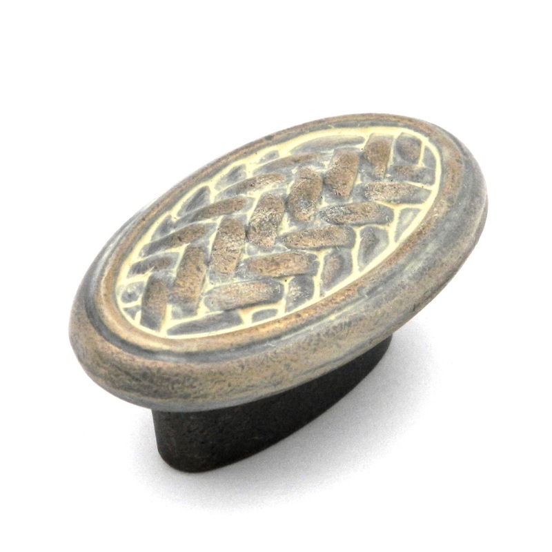 Blonde Antique 2" oval cabinet knob with basket weave center, model P7512-BOA from Belwith's Catamaran collection. Attach with 1 or 2 Screws.Belwith Hickory Hardware Catamaran collectionBlonde Antique Finish Rustic weave designIncludes one screw for center