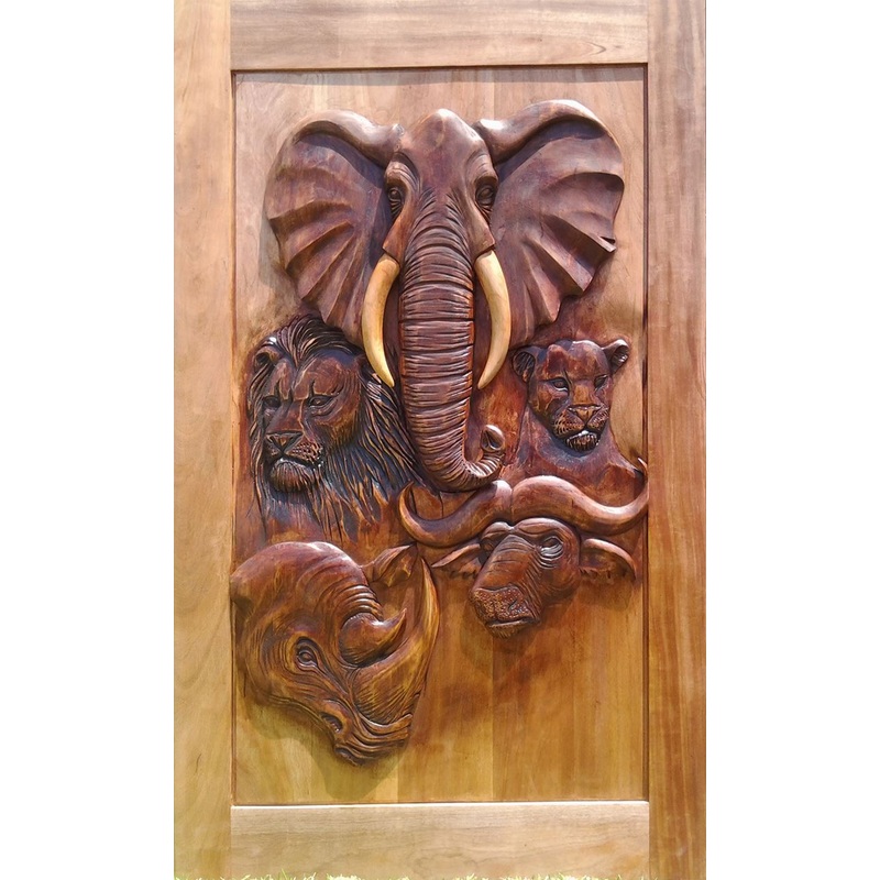 1200W X 2032Solid Kiaat Hand Carved Big 5 Pivot DoorFeaturesMade from solid Kiaat hardwood timberDoor weight is +- 110 kilograms.Hand Carved with amazing detail.Pivotdoor is pre hung in frameSupplied with 2 leaver roller catch lock installed and heavymm du