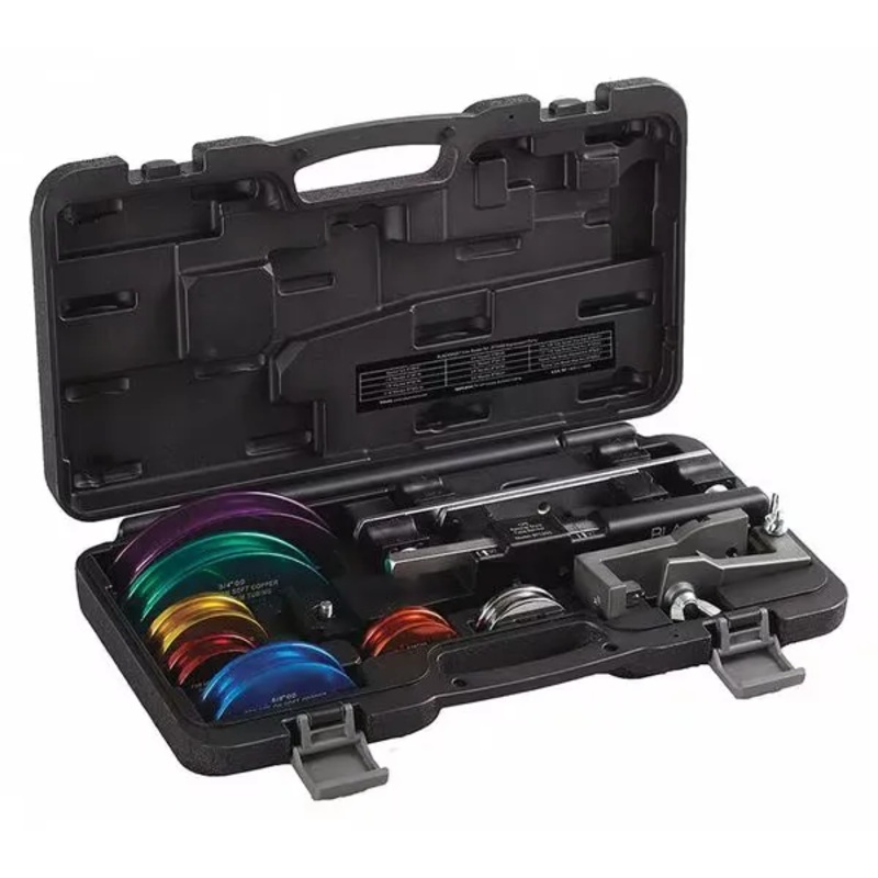 BLACKMAX BTB300 Ratcheting Tubing Bender Set, ManualRatcheting Tubing Bender Set, Bend Mechanism Style Ratchet-Driven, Bend Type Markings Calibrated Angle Markings from 0 to 90 Degrees, Tubing Outside Diameter 1/4 in, 5/16 in, 3/8 in, 1/2 in, 5/8 in, 3/4 in, Compatible Tubing Material Aluminum, Soft Copper, Bend Angle Minimum 0 Degrees , Bend Angle Maximum 90 Degrees , Centerline Bend Radius 1/2 in, 1/4 in, 3/4 in, 3/8 in, 5/16 in, 5/8 in, 7/8 in, Application Soft Copper and Aluminum TubeDimensionsOutside Dia. Tubing (In.)1/4 in, 5/16 in, 3/8 in, 1/2 in, 5/8 in, 3/4 inCenterline Bend Radius2 1/2 in to 6 inOverall Length (In.)12 5/8 inOutside Dia. Tubing (mm)22Tubing Outside Diameter1/4 in, 5/16 in, 3/8 in, 1/2 in, 5/8 in, 3/4 inOverall Length12 5/8 inCenterline Bend Radius11/2 in, 1/4 in, 3/4 in, 3/8 in, 5/16 in, 5/8 in, 7/8 inDetailsItemRatcheting Tubing Bender SetTypeManualBend Angle (Deg.)0 to 90Handle TypeNon CushionedConstructionAluminumMarkingsCalibrated Angle Markings From 0 Degrees To 90 DegreesApplicationSoft Copper Tube BendingFeaturesColor CodedBend Angle Minimum0 DegreesPower SourceRatchetingBend Mechanism StyleRatchet-DrivenBend Type MarkingsCalibrated Angle Markings from 0 to 90 DegreesCompatible Tubing MaterialAluminum, Soft CopperIncludes2 and 3 Jaw Gear PullersMandrel Material1AluminumBend Angle Maximum90 Degrees