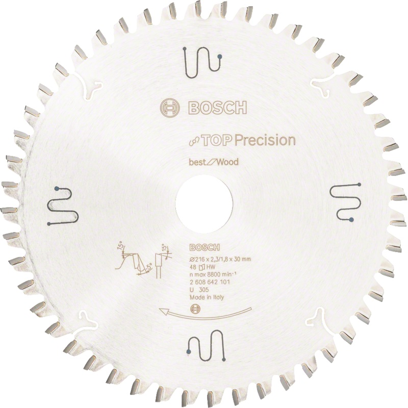 Part number2 608 642 101DetailsOuter diameter mm216Bore size mm30Width of cut (b1) mm / Base bl. thickness (b2) mm2.3/1.8Number of teeth48Tooth shapeATBMax. rotation speed (RPM)8800Cutting resultClean cutHook angle -5Relief angle 15Made in Italyfor BoschGC