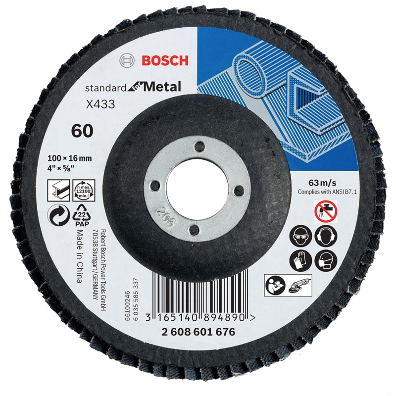 Good FinishX433 Standard for Metal provides a good finish for grinding edges, welded seams and coarse-sanded metal surfacesDetails Disc diameter mm100Bore diameter mm16.00GritPart NumberPriceG36260860167551.00G60260860167651.00G80260860167751.00G1202608601