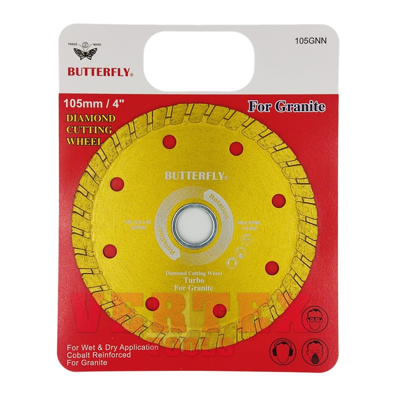 Specifications:For GraniteFor Wet & Dry ApplicationModel: 105GNNSize: 105mm / 4"Max RPM: 14,500Butterfly brand