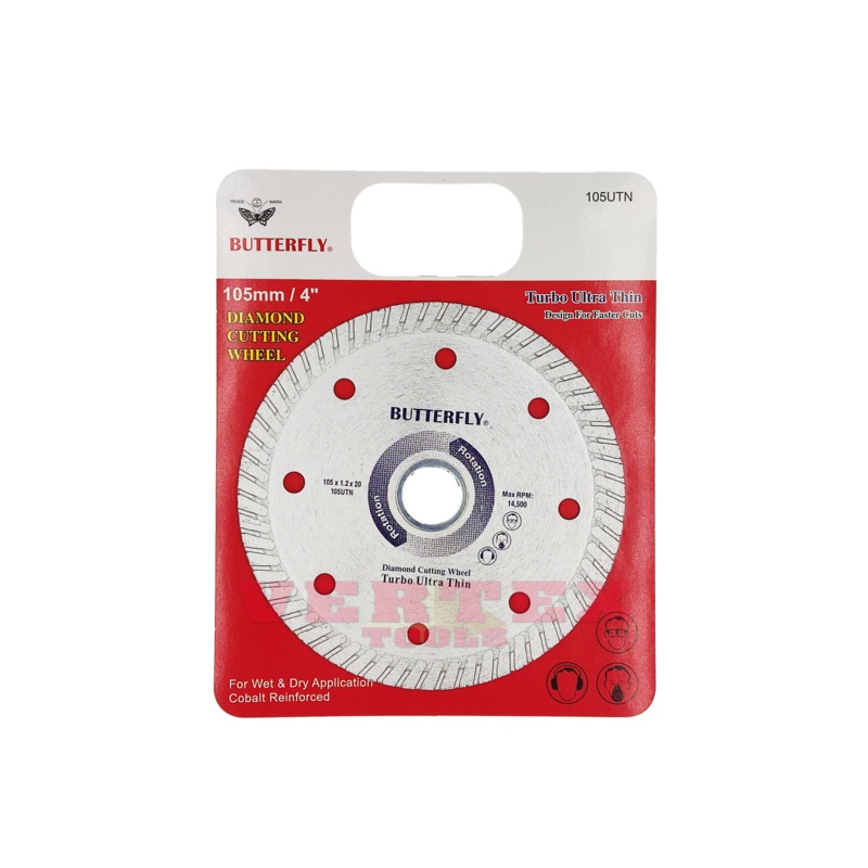 Specifications:Turbo Ultra ThinFor Wet & Dry ApplicationDesign For Faster CutsModel: 105UTNSize: 105mm / 4"Max RPM: 14,500Butterfly brand