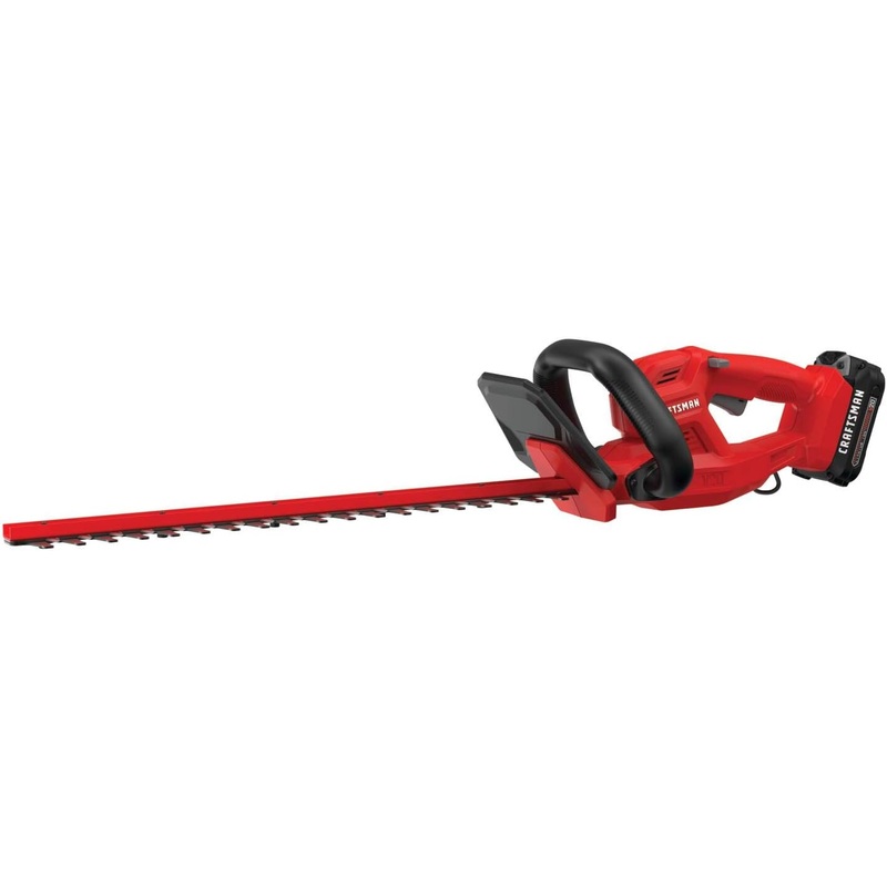 CRAFTSMAN V20 Cordless Hedge Trimmer, 20 inch, Battery and Charger Included (CMCHT810C1)Built with a reliable motor and a conveniently rechargeable 1.5Ah battery, the V20* Cordless 20 in. Hedge Trimmer Kit allows you take on a days work with confidence and finish with pride. With a full wrap-around handle designed with your comfort in mind, the hedge trimmers dual action blades quickly cut through branches up to 3/4 in. thick. Once the job is done, conveniently store by hanging the trimmer in your garage using the integrated VERSATRACK hook which is compatible with the VERSATRACK system (sold separately). V20* battery platform is compatible with CRAFTSMAN V20* Outdoor Equipment and Power Tools. Youll find the complete line of outdoor tools and equipment essentials for a job to make you proud.RELIABLE AND RECHARGEABLE POWER: V20* MAX 1.5Ah lithium ion battery provides dependable performanceMOVE AROUND WORKSPACE WITH EASE: Full wrap-around handle for mobility and comfort while cuttingDURABILITY FOR TOUGH TASKS: 20 in. dual action blades with up to 3/4 in. cut capacityVERSATRACK COMPATIBLE: Use the integrated hook to hang this tool directly on the VERSATRACK Wall Organization System (sold separately)Product informationBrandCRAFTSMANPower SourceBattery PoweredColorRedProduct Dimensions5.58L x 4.5W x 33.91HItem Weight6.61 PoundsBlade Length20 InchesMaterialPlasticBlade MaterialMetalCutting Width0.75 InchesUPC885911719544Item Weight6.61 poundsManufacturerCRAFTSMANCountry of OriginChinaItem model numberCMCHT810C1Batteries1 Lithium Ion batteries required. (included)