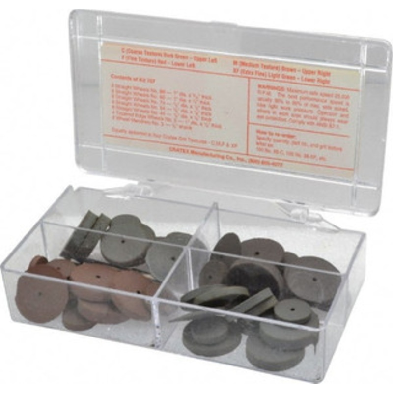 Cratex 38 Piece Rubberized Small Abrasive Wheel Set Mounted on 1/8" Diam Shank, Mandrels IncludedManufacturer Part #: 707S/N: 76266634UNSPSC: 23131514(Minimum Order Quantity=1, Package Quantity=1)Specifications:Bond TypeRubberMandrel IncludedYesMountedYes