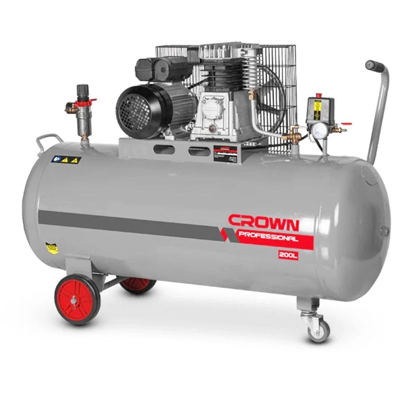Crown CT36032 Air Compressor Belt-Driven 8Bar 200L Manometer Variable pressure Pressure protection TemperatureprotectionSpecificationsNo-Load speed: 980rpmTank Capacity: 200LMax. Pressure: 8 barVoltage Rating: 220V/60HzAir Displacement: 250L/min.Weight: 88
