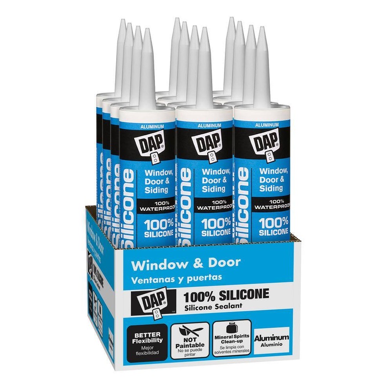 DAP 7079808643 Silicone 9.8 oz. Aluminum Gray Window, Door and Siding Sealant (12-Pack)DAP 100% Silicone Rubber Window, Door & Siding Sealant is a durable, 100% waterproof and weatherproof, all-purpose sealant. Works great for caulking and sealing out drafts, water and moisture around windows, doors, siding, gutters, flashing, pipes, vents and more. All purpose aluminum silicone stays flexible to withstand expansion and contraction without cracking or losing adhesion. The cured silicone sealant is mold and mildew resistant. DAP caulk and sealants provide durable performance for a variety of projects.100% waterproof sealant protects and seals a variety of projects including windows, doors, siding, gutters, vents and moreSilicone rubber formula provides a flexible bond that wont crack or lose adhesion12 hour rain ready providing same day protection from the elementsAluminum silicone sealant works in a variety of exterior or interior applications and features great flexibility allowing it to hold up to changing conditionsMeets ASTM C920, Class 25Sealant is not paintable, paint surfaces prior to applying sealantCured sealant is mold and mildew resistant, providing additional protection after full cureClean up excess uncured sealant from tools or surfaces with mineral spiritsDimensionsIndividual size (oz.)9.8 ozDetailsCaulk and Sealant ApplicationWindow & DoorCaulk and Sealant TypeSiliconeCaulk FormStandard TubeColor/FinishAluminum GrayCoverage (linear ft.)55Cure Time (hours)24Dry Color FamilyAluminumDry to Touch (min.)10 minFeaturesMoisture Resistant, Mold and Mildew ResistantIndoor/OutdoorIndoor/OutdoorInterior/ExteriorExterior, InteriorKitNoNumber of Tubes Included12Paint Tool Product TypeCaulkAdditional ResourcesFrom the ManufacturerSDSProduct LabelTDS