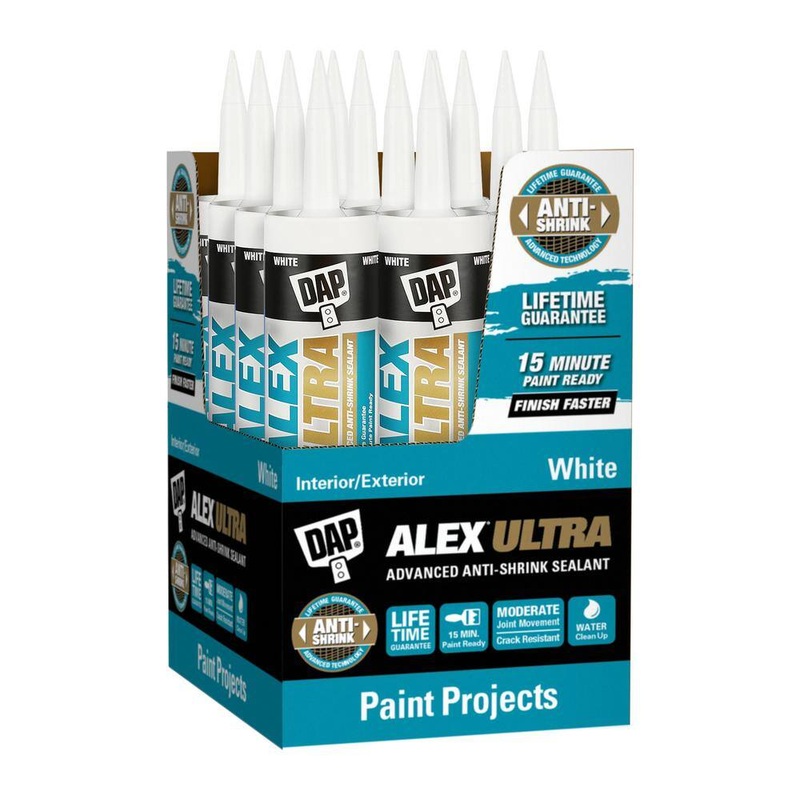 DAP 7079818200 Alex Ultra 10.1 oz. White Advanced Anti-Shrink Sealant (12-Pack)DAP Alex Ultra Advanced Latex Sealant is a high performing acrylic latex sealant that offers exceptional performance for the Pro Painter. With Anti-Shrink technology, it is designed to shrink less, creating a more durable long-lasting seal that wont crack after paint. It can be brush painted in just 15 minutes after application or spray painted immediately for improved productivity. This low shrink, durable, flexible sealant applies smoothly & easily, is low in odor, and doesnt pick up dirt. It has superior adhesion to a wide variety of surfaces, provides a 100% waterproof seal and cured caulk is mold and mildew resistant. Sealant exceeds ASTM Specification C834 and works for interior and exterior applications.Paintable caulk can be brush painted in 15 minutes or spray painted immediately after application allowing or quick project completionWorks on many surfaces including wood, plaster, drywallTop applications include baseboards, crown molding, interior door casings and interior wood trimWhite caulk wont shine through or discolor paint, is low in odor and has easy water clean-upAcrylic latex formula with anti-shrink technology for interior and exterior use, creates a long lasting sealPaintable caulk dries tack free in 5 minutes and is ready for brush on paint in 15 minutes100% waterproof painters caulk is mold and mildew resistant when curedFully cures in 24 hoursDimensionsIndividual size (oz.)10.1 ozDetailsCaulk and Sealant ApplicationMultipurposeCaulk and Sealant TypeLatexCaulk FormStandard TubeColor/FinishWhiteCoverage (linear ft.)55Cure Time (hours)24Dry Color FamilyWhiteDry to Touch (min.)15 minFeaturesMoisture Resistant, Mold and Mildew Resistant, PaintableIndoor/OutdoorIndoor/OutdoorInterior/ExteriorExterior, InteriorKitNoNumber of Tubes Included12Paint Tool Product TypeCaulkSeriesAlex UltraAdditional ResourcesFrom the ManufacturerSDSSafer Choice StandardTDSBuying GuideProduct Label