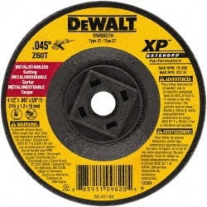 DeWALT 24 Grit, 4-1/2" Wheel Diam, Type 27 Depressed Center Wheel Zirconia Alumina, Resinoid Bond, 13,300 Max RPMManufacturer Part #: DW8857HS/N: 60703782UNSPSC: 23131503UPC: 885911098205(Minimum Order Quantity=10, Package Quantity=1)(Please order in multi