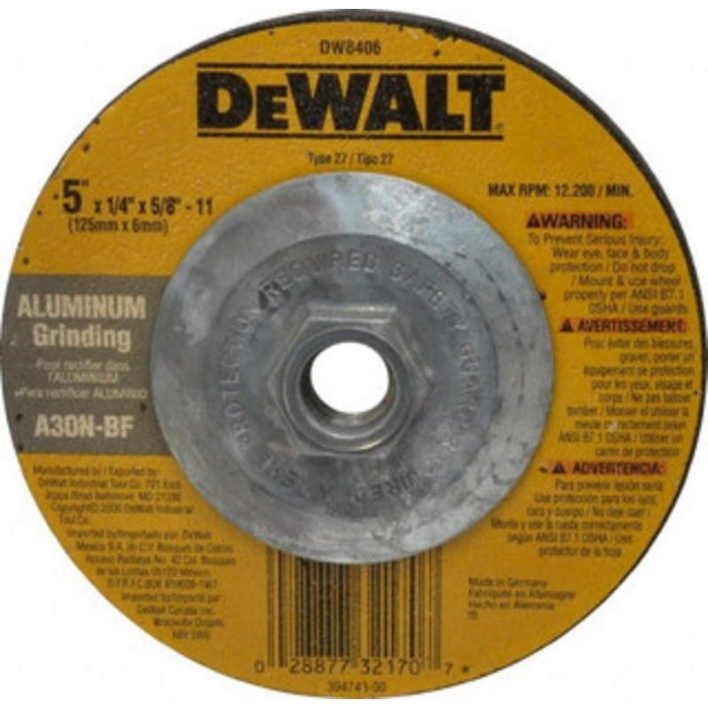 DeWALT 30 Grit, 5" Wheel Diam, 1/4" Wheel Thickness, Type 27 Depressed Center Wheel Aluminum Oxide, N Hardness, 12,200 Max RPM, Compatible with Angle GrinderManufacturer Part #: DW8406S/N: 08701898UNSPSC: 23131503(Minimum Order Quantity=1, Package Quantity