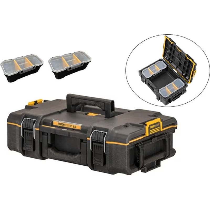 The ToughSystem 2.0 DS166 Toolbox has patented auto-connect side latches, allowing for one-hand operation. It also has 2-piece metal wire front latches for added durability when securing tools inside the box. This toolbox offers 20% more tool storage when used as part of a tower with the 2.0 DS300 and DS400. It is IP65 rated for dust and water resistance and has a 50 Kg. load capacity. The toolbox contains 2 large organizer cups on the inside with removable dividers for optimal organization. The ToughSystem 2.0 Toolbox is compatible with all ToughSystem products.