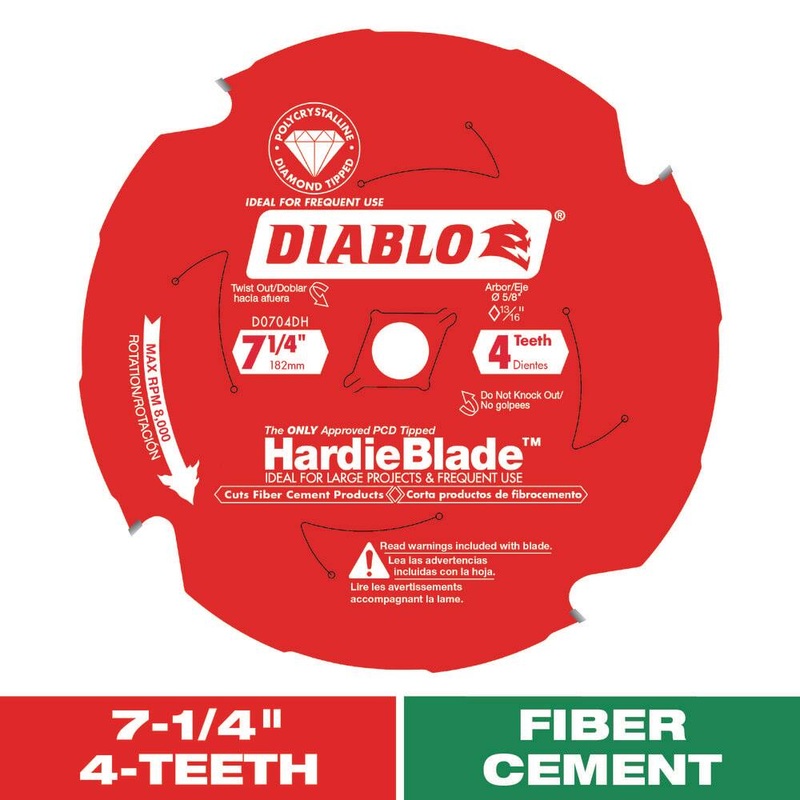 DIABLO D0704DH 7-1/4in. x 4-Teeth HardieBlade Saw Blade for Fiber CementDiablos HardieBlade range is the only approved PCD (PolyCrystalline Diamond) tipped fiber cement range recommended by James Hardie Building Products. Diablos co-branded blade generates up to 50% less respirable dust while also delivering the longest blade life in all fiber cement materials. The PCD triple chip design offers up to 75X longer cutting life than standard carbide blades while a laser cut thin kerf design gives fast and precise cuts. The anti-vibration design stabilizes the blade while cutting, while the Perma-SHIELD coating to reduces heat, gumming and corrosion.The only approved James Hardie polycrystalline diamond (PCD) tipped fiber cement saw bladeThe PCD triple chip design offers up to 75X longer cutting life than standard carbide bladesPerfect for full time use in heavy duty applications like cutting multiple pieces of fiber cement boardNote: Dust generation does not necessarily correlate directly to exposure riskPerma-SHIELD non-stick coating for protection against heat, gumming and corrosionLaser-cut stabilizer vents to trap noise and reduce vibration for accurate cutsDimensionsBlade Diameter (in.)7-1/4 inDetailsArbor Size0.625 In.Color FamilyRedMaterial CutFiberNumber in Package1Number of Teeth4Power Tool Accessory TypeCircular Saw BladeSaw Blade MaterialDiamondTools Product TypePower ToolAdditional ResourcesFrom the ManufacturerSpecification
