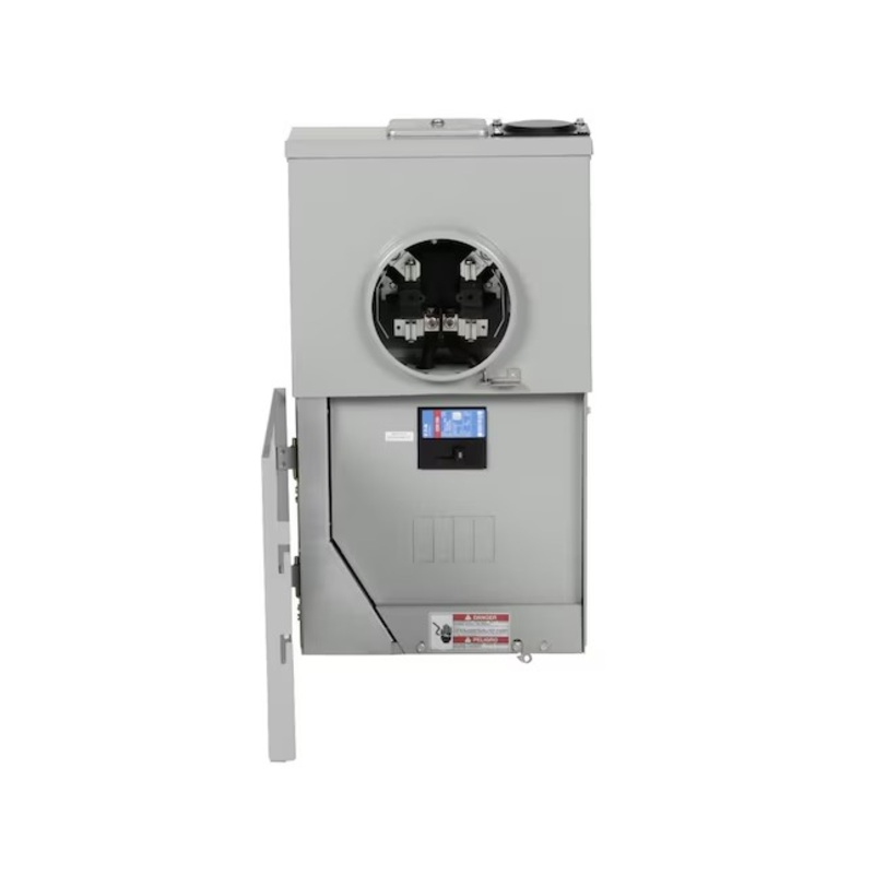 Eaton MBT48B200BTSBL Type BR 200 -Amp 4 -Spaces 8 -Circuit Outdoor Main breaker meter combo Load CenterEatons meter breakers combine a single meter socket and a main circuit breaker and/or loadcenter into one enclosure. Certain utilities will specify a meter breaker instead of a meter socket and loadcenter. The meter breaker is used where electricity enters a home or dwelling. The utility attaches a meter in the socket to measure power consumption. The loadcenter portion is used to distribute the power throughout the home using various circuits. Eaton offers a variety of designs to meet local utility specifications. UL listed.Type BR 200 amp meter breaker panel 4 spaces and 8 circuitsPanel contains a provision and bracket to insert a barrel lock in order to reduce theft of electrical power (barrel lock is not provided)Contains a CSR2200 main breakerMain breaker rated 22 kAICAccepts type BR breakers onlyBottom and top breaker feedBarrel lock is not includedThis is a Non-EUSERC panelGeneralManufacturer Color/FinishGrayTypeMain breaker meter comboSeries NameType BRDimensionsDepth (Inches)6.75Width (Inches)15Height (Inches)27.25FeaturesAmperage200OrientationOver/UnderBuss Bar ConstructionAluminumPaintableYesCircuits8Phase TypeSingle phase (120/240)Cover IncludedYesPlug-On NeutralNoFeed-Through LugsYesUsageService entranceGround Bar InstalledYesUse LocationOutdoorMounting TypeSurfaceValue PackNoNumber of Spaces4CompatibilityBrand/Model CompatibilityFits most
