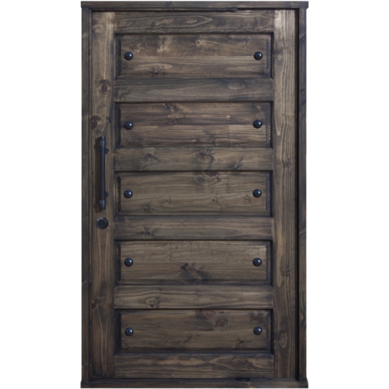 Ebony Studded 5 Panel Pivot Door 1200W X 2032 Pre Hung Pine Pivot Door in Frame complete with factory fitted lock, pivot hinge & resin handlesFeaturesPre hung pivot doorPine timber.Includes a moulded set of handlesElzette Lock & pivot hinge fittedIncludes door studsPre Stained at factoryDoor opens inwards. Available in both left & right hand opening.Design only on outside face. Flush panel on the inside.Provided correctly treated, this unit is suitable for Semi Exterior applications (must not be exposed to direct weather)Exterior D3 Glue used throughout1 Year Guarantee