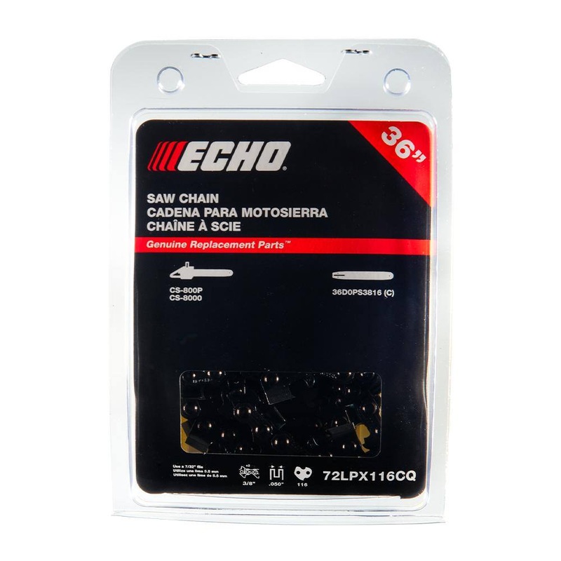 ECHO 72LPX116CQ 36 in. Chisel Chainsaw Chain 116 LinkECHOs 36 in. replacement chain (72LPX116CQ) is designed with professional loggers and forest workers in mind. Power and precision are the name of the game with this chain. The low-vibration full chisel cutters deliver ultimate performance, while the offset depth gauges prevent cutters from driving into the sidewall, which in turn provides a smoother cut. The enhanced cutter coating provides superior protection against corrosion resistance. By replacing your chain with a genuine ECHO replacement chainsaw chain thats been manufactured to deliver maxium performance and reliability you help to extend the life of your chainsaw bar and keep your equipment running at peak performance. This chain fits ECHO bar: 36D0PS3816C.For questions about service and repair, please call Echo at 1-800-432-ECHO or reference the Service & Repair documentStandard chisel cutters with extra chome layers for tough cutting environmentsCompatible with 36DOPS3816C ECHO guide bar for the CS-800PTop plate filing indicators make sharpening easierStandard sequence cutting typeBumper drive lengths help reduce kickback0.050 in. gauge and 3/8 in. pitchDimensionsAssembled Depth (in.)4.95 inAssembled Height (in.).746 inAssembled Width (in.).305 inBar Length (in.)36 in.Chainsaw File Size7/32 in.DetailsChain Pitch3/8 in.Chainsaw Part/Accessory TypeChainsaw ChainDrive Links116FeaturesRust ResistantFits BrandsECHOFits ModelsCurrent Models: CS-800P Older Models: CS-8000Gauge.050 in.Pack Size1Additional ResourcesFrom the ManufacturerReplacement Part ListService and Repairs