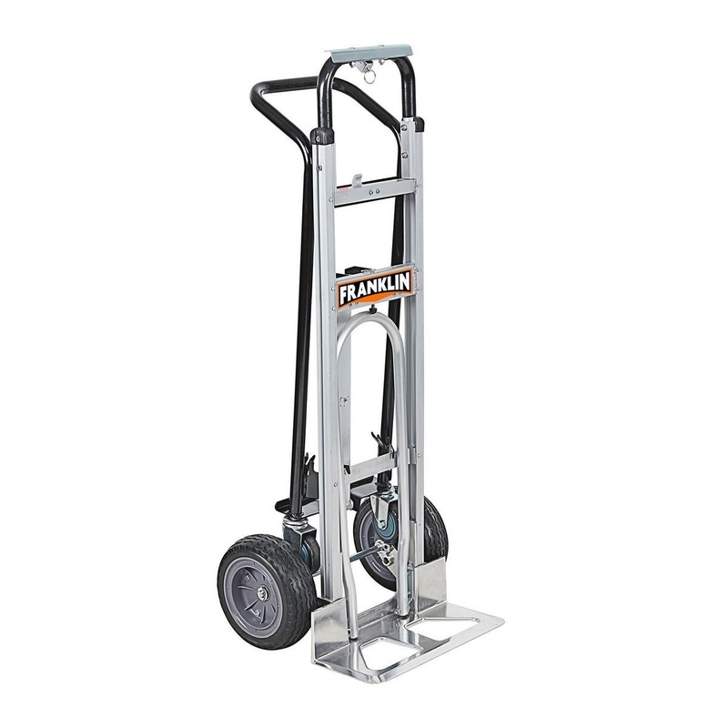 FRANKLIN FKL-1000-44-in-1 Convertible Hand Truck, 500 lb./800 lb./1000 lb. CapacityThis 4-in-1 convertible hand truck can be used upright as a sturdy high capacity hand truck or convert in seconds into a rugged platform truck. The truck is constructed from lightweight aluminum and durable steel. The truck has nonmarring rubber wheels for easy maneuvering.Sturdy platform truck configuration handles up to 1000 lb.Adjusts to a 500 lb. capacity 45 platform for sorting and restockingStandard hand truck configuration handles up to 800 lb.Box lifter configuration handles oversize loadsThe ergonomic design converts quickly and easilySpecificationsSKU(s): 70027Brand: FRANKLINModel: FKL-1000-4Product Height: 51-3/4 in.Product Length: 20-5/8 in.Product Weight: 38.1 lb.Product Width: 18-1/4 in.Shipping Weight: 37.47 lb.Tire Size: 10 in.Working Load: 1000 lb. capacity horizontal, 800 lb. capacity vertical