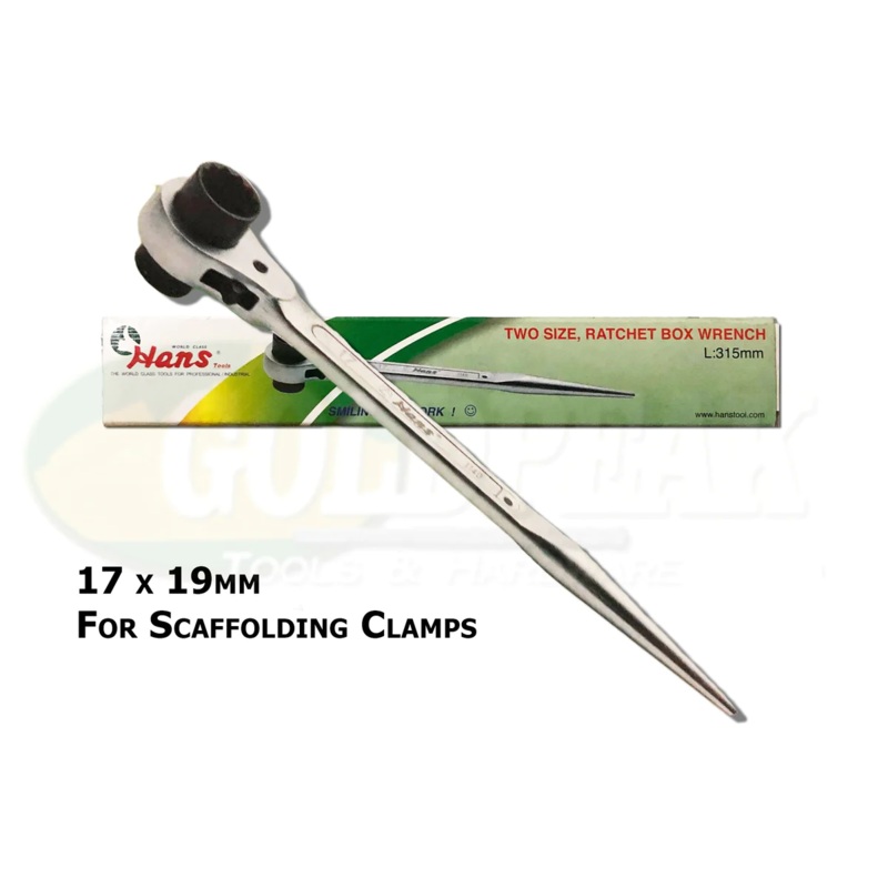 Two Size , Ratchet Box WrenchLength: 315mmSize: 17 x 19mmApplications:Used for clamps in scaffoldingOther Sizes: Size (mm)Price10x121,200.0011x131,200.0012x141,200.0014x171,200.0017x191,400.0017x211,400.0017x221,400.0019x211,400.0019x221,400.0019x241,800.0