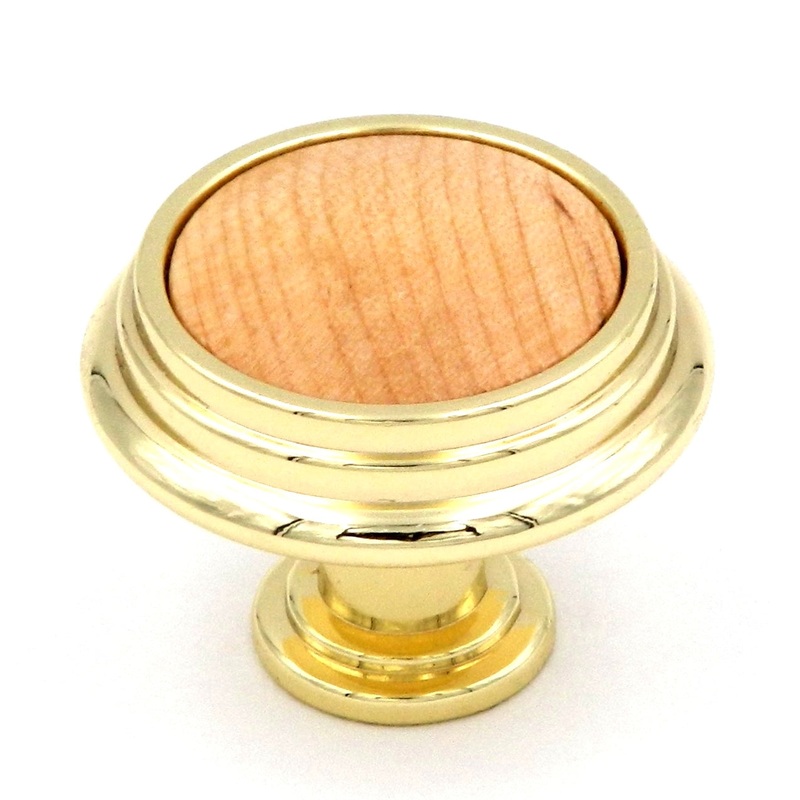 P415-NM Polished Brass Natural Maple 1 1/4" Wood, Zinc Cabinet Round Knob from Belwith Hickory Hardware's Woodgrain collectionWoodgrain collectionPolished Brass Finish with Natural MapleNatural Maple Woodgrain Center Durable Wood, Zinc constructionDiameter