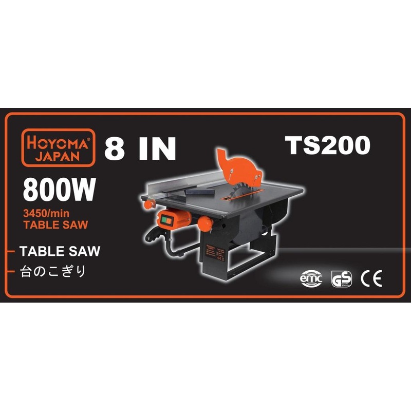 HOYOMA TABLE SAW 8" TS200voltage frequency:220v~60hzinput power: 800w S2 10minno~load speed: 3450/min-1saw blade: (8") 200*16*2.4mmtable size: 505*335mmmax. cutting depth: 43mm(90) 27mm(45)Lifetime Service Warranty