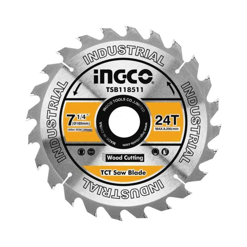 Ingco TSB118511 TCT Circular Saw Blade 7-1/4" 24T185mm(7-1/4")24TArbor: 20mmWith 16mm reduction ringSuitable for Circular Saw for models: CS18528 and CS185682Wood cutting