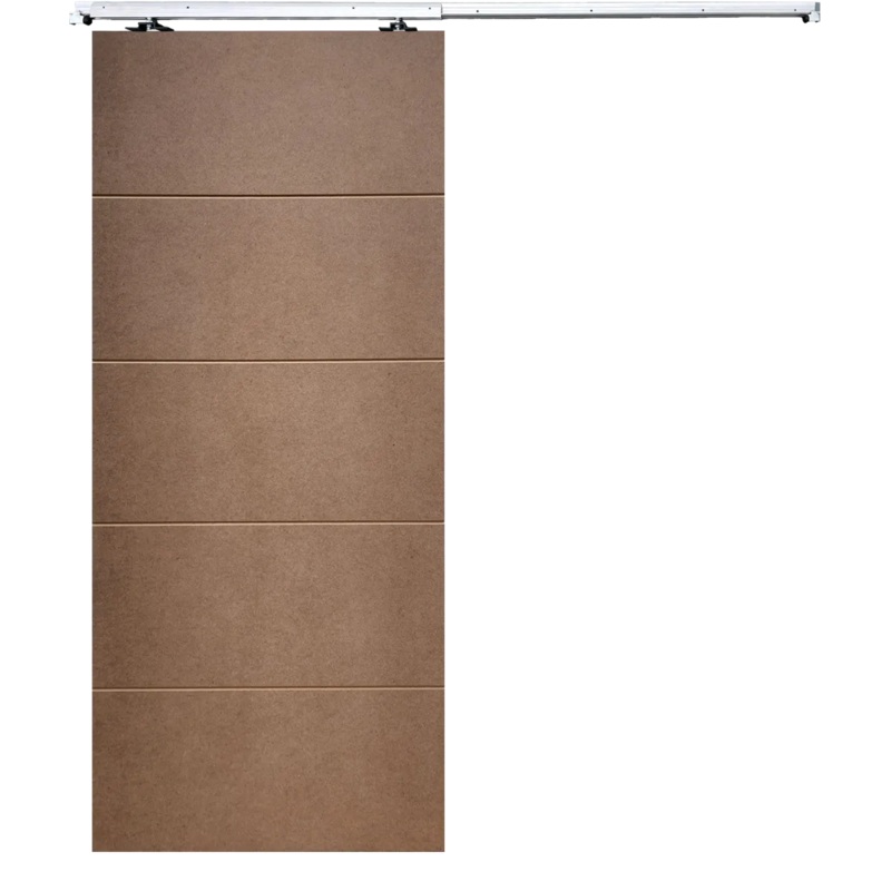 This cost-effective interior sliding door features a light-duty flush panel MDF design with 4 horizontal shallow grooves, creating a 5-panel look. Paired with the durable SA Sliding Door Poltava system, this setup is ideal for spaces where both functionali