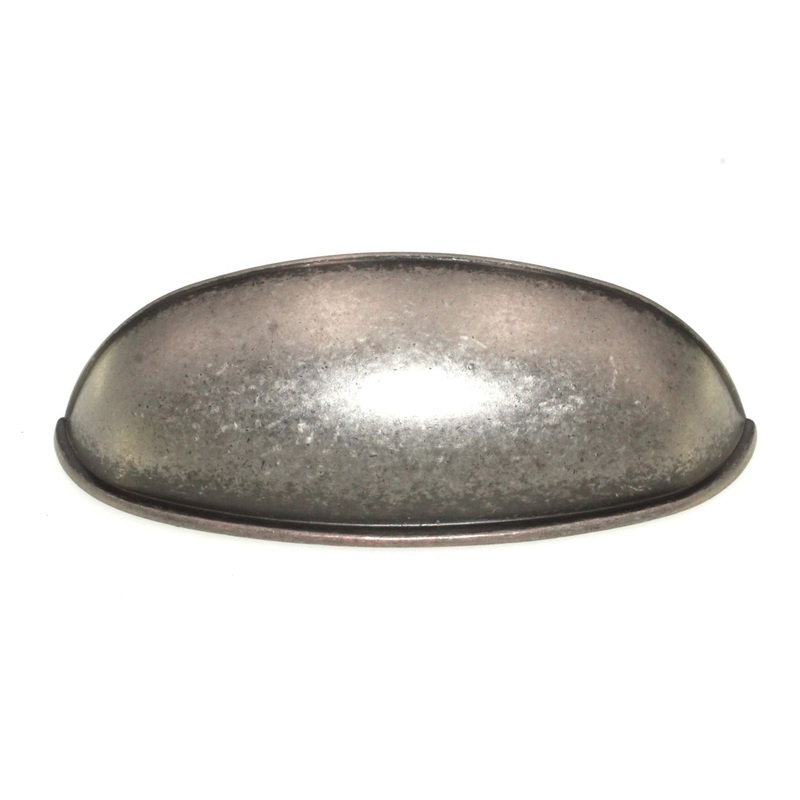 Antique Iron rustic drawer cup pull handle with 2 1/2 inch (64mm) or 3 inch center screw spacing, model PN1053-AI from Liberty Hardware.Liberty drawer cup pullAntique Iron finish, quality zinc materialsFor cabinet and furniture drawersDouble drilled for du