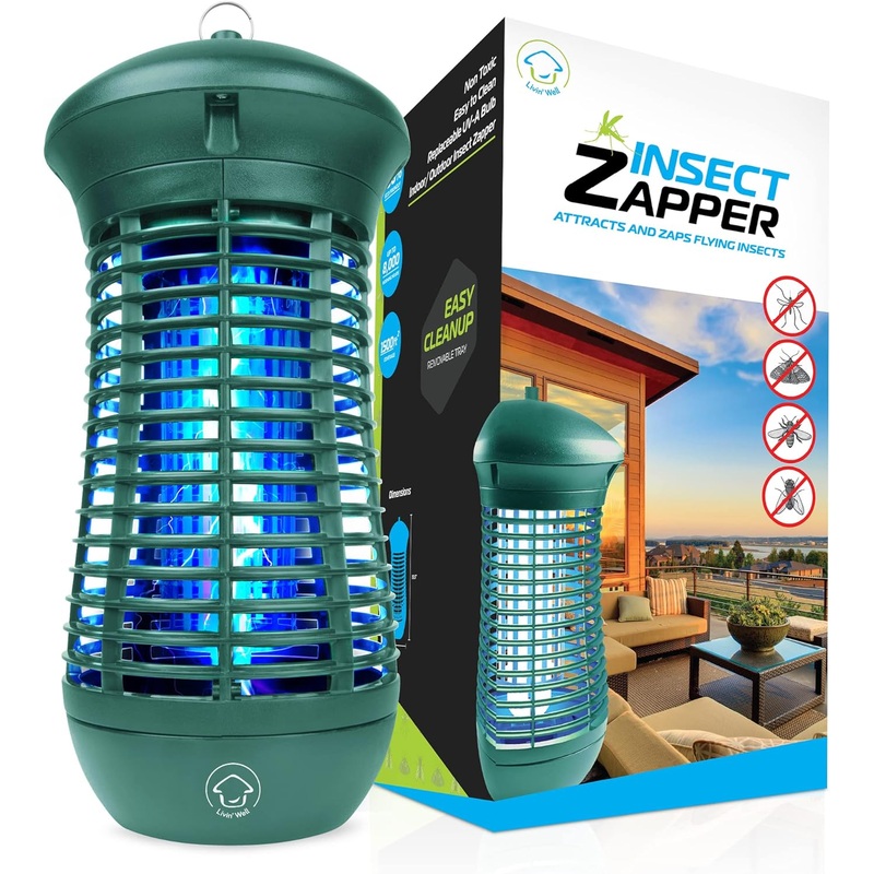 Livin Well Green Bug Zapper Indoor Outdoor 4000V High Powered Electric Mosquito Zapper Home Patio, 1,500 Sq Ft Range Fly Zapper Mosquito Trap, 18W UVA Bulb Mosquito Killer Lamp Insect Bug LightHigh Powered Bug Zapper: A convenient and effective fly zapper and mosquito killer bug zapper for home and patio; this outdoor / indoor mosquito zapper uses 4,000V of electric fly killer power and high efficiency long lasting UVA Bulb to effectively get rid of flying pestsWider Defense Range Up to 1,500 Sq. Ft.: Use this weatherproof bug zapper outdoor and indoor for living spaces like your bedroom, living room, kitchen, patio, deck, and backyard safe from flying and biting insectsMulti-Insect Bug Control: Attracts, zaps, catches, and traps a variety of flying pests. Including mosquitoes, flies, gnats, fruit flies, moths, wasps, and moreTriple Mosquito Control: Featuring an 18W UVA bug light indoor and outdoor, a family safe galvanized steel insect killer grid, and an insect trap. This bug zapper lamp features a standing base with 6-ft. cord and a UV lamp hook for hangingLonger Lasting UVA Mosquito Light: These bug zappers measure 6.31 D x 13.18 H and last up to 8,000 10,000 hours to protect your home all year long; The pest lamp bulbs are produced by full automatic production lines for stable quality assurance and durabilityEasy Clean Electric Bug Zapper: Unscrew and rinse the bottom mosquitoes trap tray for easy cleanup. Big enough to hold solid insect attractants; EPA Establishment Number 89857-CHN-1Product informationBrandLivin WellColorGreenStyleLarge 4000V GreenMaterialABS Plastic and Galvanized Metal GridProduct Dimensions6.31L x 6.31W x 13.18HNumber of Pieces1Is ElectricYesTarget SpeciesFly, Mosquito, GnatItem Weight2.35 poundsManufacturerLivin WellCountry of OriginChinaItem model numberGH-18A Green