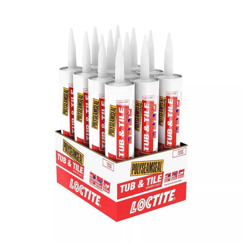 Loctite 2137997 Polyseamseal Tub and Tile 10 oz. Clear Latex Caulk Sealant (12-pack)Loctite Polyseamseal Tub and Tile Adhesive Caulk is a premium, water-based sealant thats specifically designed for sealing projects in your kitchen and bathroom. Seal and Bond technology gives it the long-lasting bonding properties of an adhesive with the sealing strength of a caulk, making Polyseamseal Tub and Tile even more durable and versatile. Our cured sealant also contains a mildewcide that effectively prevents mold and mildew growth, so it can be used in humid and steamy areas like the shower and sink. Loctite Polyseamseal Tub and Tile Caulk contains an acrylic-based sealant that gives you a flexible, watertight seal around toilets, baseboards, and grout work. Plus, our caulk is paintable and resists color change and chemical abrasion, so you get a clean, professional finish every time. Loctite Polyseamseal Tub and Tile is also low odor, non-flammable, and easy to clean up with just soap and water.Caulking designed to have the strength of an adhesive and the sealing characteristics of a caulkFormulated for bonding and sealing applications around the houseCured caulk with added mildewcide to inhibit mold and mildew growthIdeal for humid or steamy areasResists color change and abrasion from harsh chemicalsUncured caulk cleans up easily with just soap and waterPaintable for a professional finishLow odor and non-flammable for interior projectsDimensionsIndividual size (oz.)10 ozDetailsCaulk and Sealant ApplicationMultipurposeCaulk and Sealant TypeAcrylicCaulk FormStandard TubeColor/FinishClearCoverage (linear ft.)30.6Cure Time (hours)24Dry Color FamilyClearDry to Touch (min.)20 minFeaturesMoisture Resistant, Mold and Mildew Resistant, Paintable, Permanently FlexibleIndoor/OutdoorIndoor/OutdoorInterior/ExteriorExterior, InteriorKitNoNumber of Tubes Included12Paint Tool Product TypeCaulkSeriesTub and TileAdditional ResourcesFrom the ManufacturerSDSTDSBuying Guide