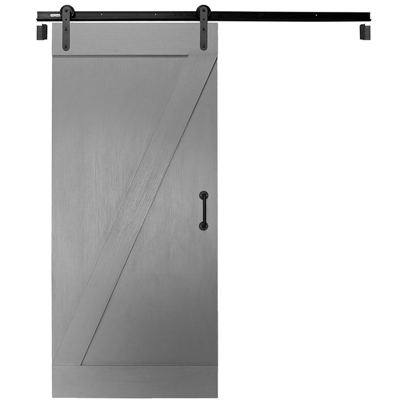 Louisiana Storm Grey Barn Door including Track & HandlesInterior sliding barn door for entrances to bedrooms and bathroomsSpace-saving interior sliding barn door with modern minimalist styling.Features a solid 32mm Storm Grey melamine build, edged with 2mm Storm Grey PVC.Comes with a black powder-coated aluminium track and two black handles for a sleek look and smooth operation.Ideal for bedroom and bathroom entrances, fitting doorway openings of 813mm x 2032mm or smaller.Door dimensions: 900mm x 2050mm, ensuring privacy and ease of use.Track installation above the doorway eliminates the need for floor tracks, providing a clean look and reducing trip hazards.Includes a bottom guide to keep the door stable and prevent swinging.Package contains all necessary components for a hassle-free installation, including a detailed instruction manual.What’s in the box1 x DoorTrack set.2x handles.Bottom guide.Screws and wall plugs.Easy to install Installation instructions.