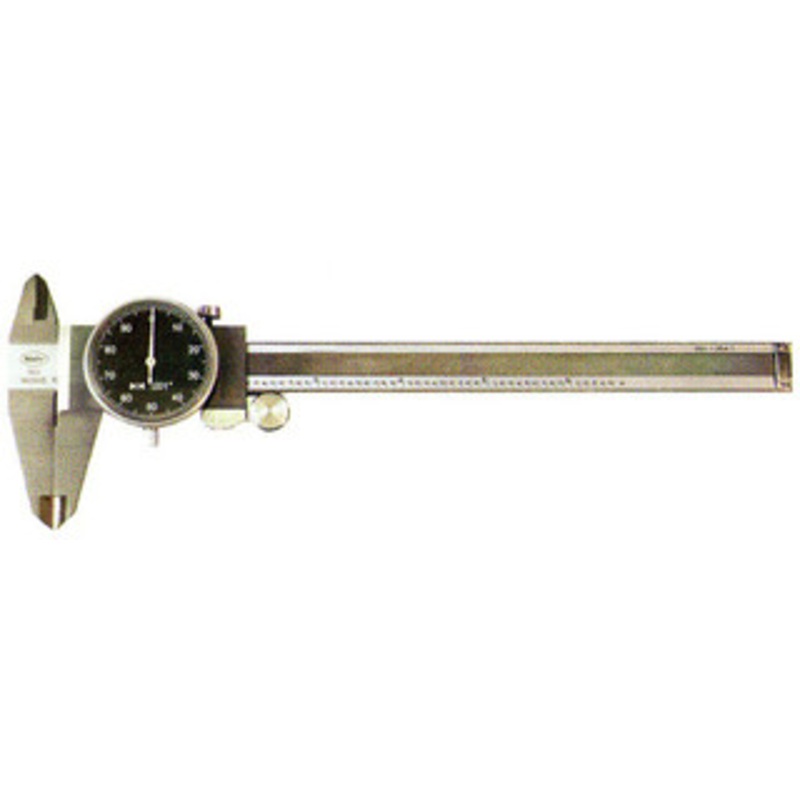 MAHR Dial Caliper 16U Black Face, 6" Range - 4107900 Large dial face with high contrast graduations Satin-chrome finished line scale. Shockproof movement. Zero setting through rotating dial and locking screw. Covered rack. Slide and beam made of hardened s
