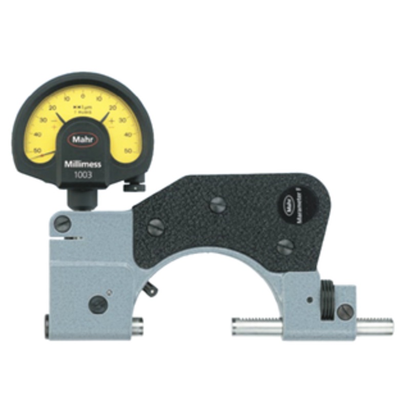 Mahr Indicating Snap Gage, 1"-2.36" 840F - 4450001 For cylindrical parts such as shafts, bolts and spindles, for thickness and length measurements. Rugged, forged steel frame with heat insulators. Measuring spindle is mounted in long guide way with lever-c