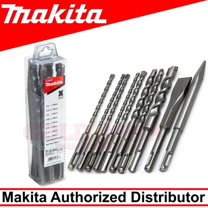 GenuineD-4636110pcsMakita SDS Plus Drill Bit SetWorks extremely well with standard SDS Rotary HammersBest used for concrete and masonry applications8 pc. SDS Plus Bit Size: 5, 5,5, 6, 6.5, 8, 10, 12, and 16 x 160mm2 pc. SDS Plus Chisels: 160mm pointed and