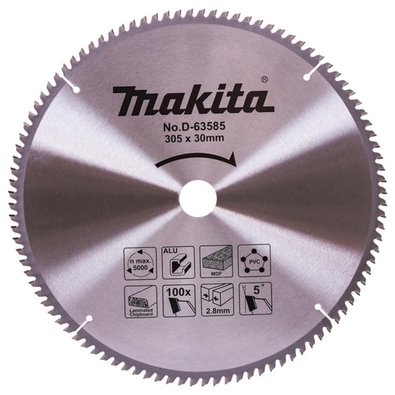 Genuine Makita D-63585 ( 305mm x 30mm ) 12" x 100T Multi Purpose TCT Circular Saw BladeMulti Material Circular Saw Blade delivers powerful cuts in a wide range of materialsHigh-quality precision-ground carbide teeth make the blade robust enough for cutting