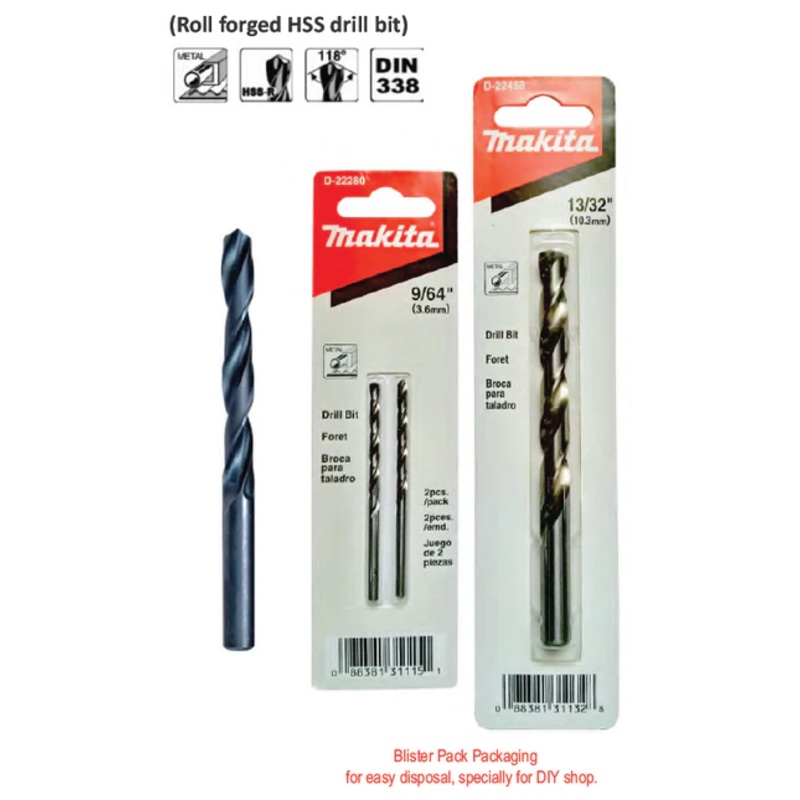 Makita HSS-R Metal Drill Bit (Blister Pack)Indicated for hole drilling steel with maximum strength 900 N/mm2, molten iron, plastics and non-ferrous metals.Minimum risk snapping diameters118 angle tip for drilling in metalRoll Forged HSS Drill Bit DiameterS