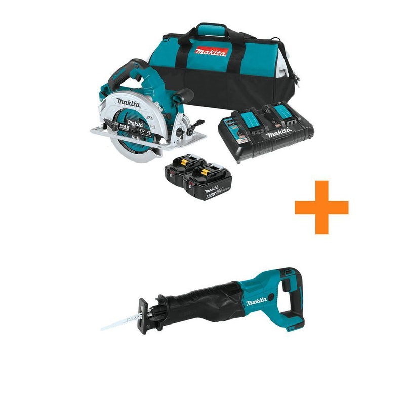 Makita XSH06PT-XRJ04Z 18V X2 LXT (36V) Brushless 7-1/4 in. Circular Saw Kit 5.0Ah with 18V LXT Reciprocating SawMakita, a pioneer in brushless motor technology and battery innovation, combines both in the 18V X2 (36V) LXT Lithium-Ion Brushless 7-1/4 in. Circular Saw Kit (XSH06PT). Its powered by two 18V LXT Lithium-Ion batteries for maximum performance and has an electronically controlled BL Brushless motor that matches torque and RPM to the application. Makita 18V X2 means freedom from the cord, even for demanding applications like cutting sheet and dimensional lumber that traditionally called for a corded saw. Best of all, users can remain in one battery platform, using the same fast-charging 18V batteries with the XSH06PT as they use across the expansive Makita 18V LXT cordless tool system. The XSH06PT has a long list of features for efficient cutting without the cord. The electronically controlled brushless motor delivers a full 6,000 RPM for efficient cutting, with Automatic Speed Change technology to adjust the cutting speed and torque under load for optimum performance. In internal testing, the XSH06PT made up to 610 crosscuts per charge in 24 SPF lumber and up to 320 crosscuts per charge in 210 SPF lumber using two fully charged 5.0Ah batteries. Added features include a large 2-5/8 in. cutting capacity at 90, and an electric brake for maximum productivity. This Promotion also comes with a bonus XRJ04Z 18-Volt LXT Lithium-Ion Cordless Reciprocating Saw (Tool-Only).