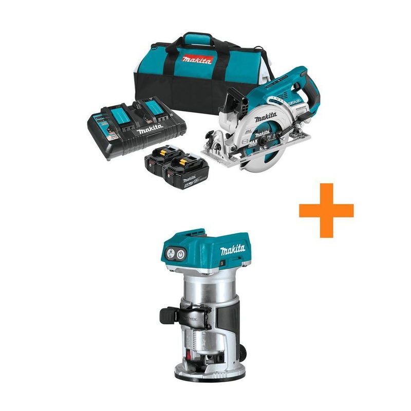 Makita XSR01PT-XTR01Z 18V X2 LXT 5.0Ah (36V) Brushless Rear Handle 7-1/4 in. Circular Saw Kit with bonus 18V LXT Brushless Compact RouterMakita, a pioneer in brushless motor technology and battery innovation, combines both in the 18-Volt X2 LXT (36-Volt) Lithium-Ion Brushless Rear Handle 7-1/4 in. Circular Saw (XSR01PT). Its powered by two 18-Volt LXT Lithium-Ion batteries for maximum performance and has an electronically controlled BL Brushless motor that matches torque and RPM to the application. Makita 18-Volt X2 means freedom from the cord, even for demanding applications like cutting sheet and dimensional lumber that traditionally called for a corded saw. Best of all, users can remain in one battery platform, using the same fast-charging 18-Volt batteries with the XSR01PT as they use across the expansive Makita 18-Volt LXT cordless tool series. The XSR01PT has a long list of features for efficient cutting without the cord. Users of leading corded saws will appreciate the blade-left rear-handle design. The electronically controlled brushless motor delivers a full 5,100 RPM for efficient cutting. In internal testing, the XSR01PT made up to 558 crosscuts per charge in 24 SPF lumber using 2 fully-charged 5.0Ah batteries. Added features include a large 2-9/16 in. cutting capacity at 90 that will cut 3X lumber in a single pass and an electric brake for maximum productivity. This Promotion also comes with a bonus XTR01Z 18-Volt LXT Lithium-Ion Brushless Cordless Variable Speed Compact Router with Built-In LED Light (Tool Only).